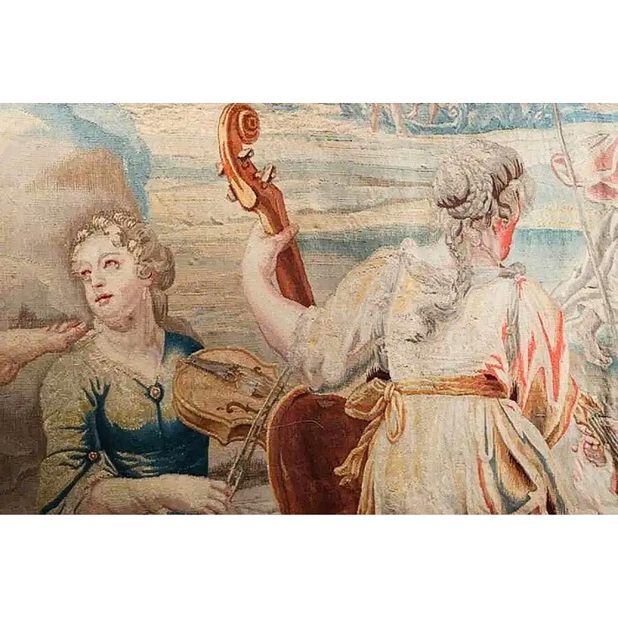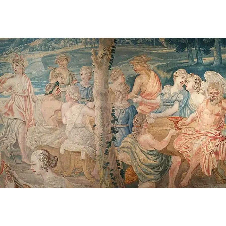 Technically ambitious in scale and execution, this Brussels tapestry demonstrates the extraordinary coordination required between designer, dyer, and master weaver. The shimmering banquet table, iridescent wings of the putti, and delicately rendered instruments reveal the remarkable ability of Brussels ateliers to translate painterly nuance into woven form. Thread is handled with such refinement that drapery folds, atmospheric skies, and subtle gestures achieve a delicacy comparable to brushwork.