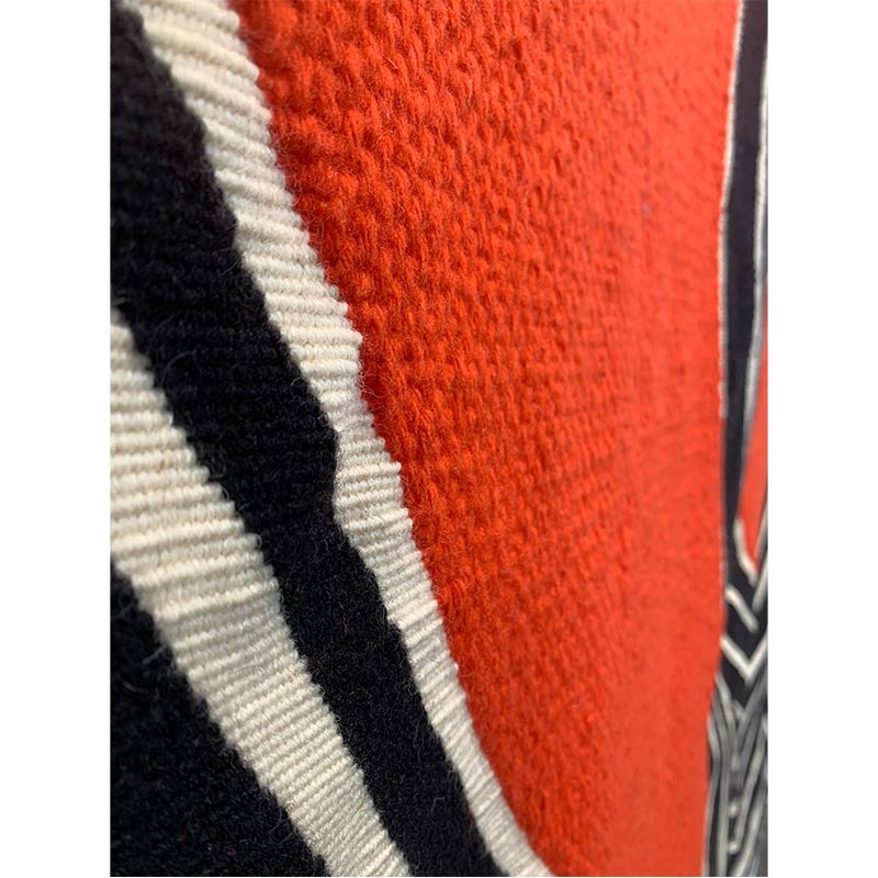 The composition also reveals subtle influences from non-Western artistic traditions, particularly African and South American visual languages. The linear forms and emphasis on bold contrast evoke a sense of symbolic abstraction, where simplicity of form carries expressive weight. The red field, intensified through the use of a slightly thicker pile, adds depth and presence, anchoring the movement of the black lines while enhancing the tactile quality of the surface.