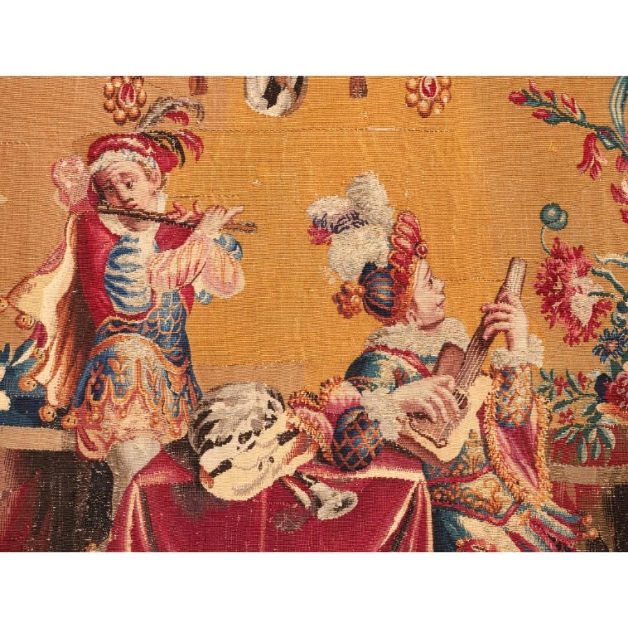 Above and around the musicians, the surface is animated by hanging garlands, floral swags, musical trophies, and exotic birds perched upon scrolling supports. These decorative elements are carefully arranged within symmetrical architectural framing, creating balance while preserving playful movement. The warm Spanish tobacco ground, characteristic of the Les Grotesques series, intensifies the richness of the palette and enhances the tapestry’s decorative impact.