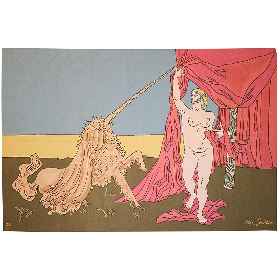 La licorne is a captivating tapestry by Jean Cocteau, woven in Aubusson by the Ateliers Raymond Picaud, that merges mythological imagery with the artist’s signature linear elegance. Rooted in Cocteau’s distinctive visual language, the work unfolds as a poetic encounter between figure and symbol, where narrative remains open and suggestive rather than fixed.