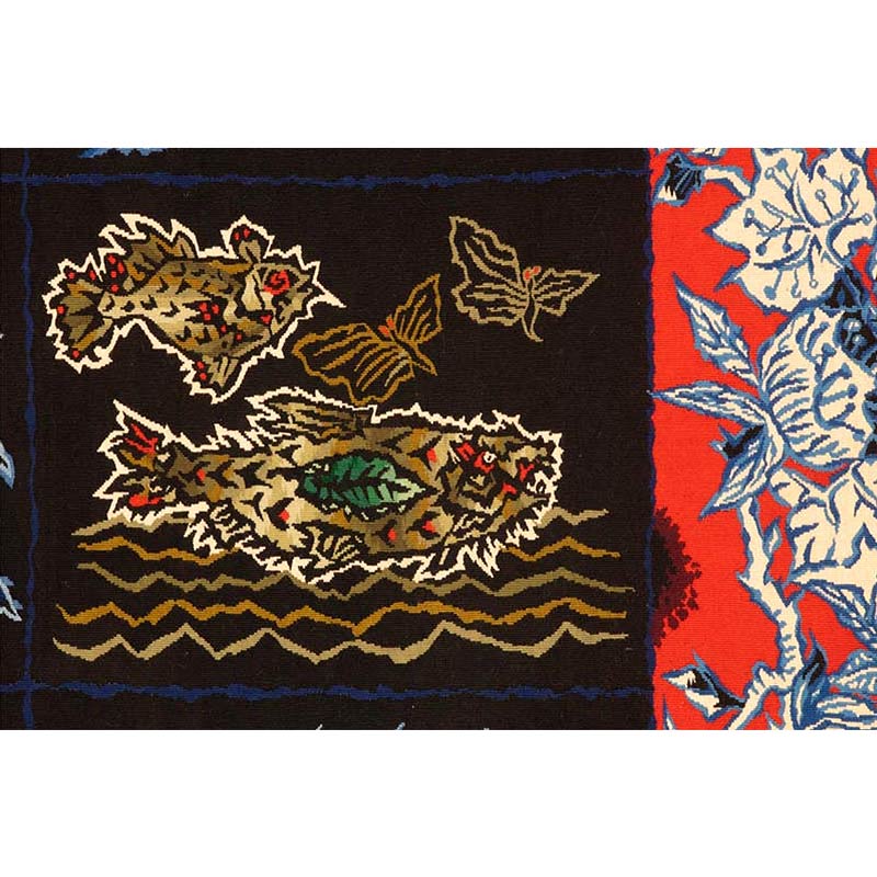 Rather than separating these creatures by environment, Lurçat brings them together. A porcupine appears alongside marine life, while a coiled serpent anchors the lower section. This blending of species suggests a broader view of nature, where distinctions between land, sea, and sky are less important than the connections between them.