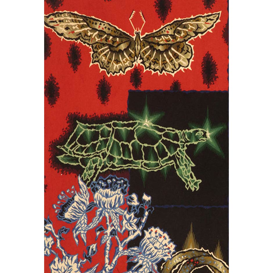 Bestiaire Corail is a richly structured tapestry by Jean Lurçat, woven in Aubusson during the mid-20th century. The work reflects a shift toward more complex compositions, where symbolic imagery is organized within a clearly defined framework while still retaining a sense of visual energy.
