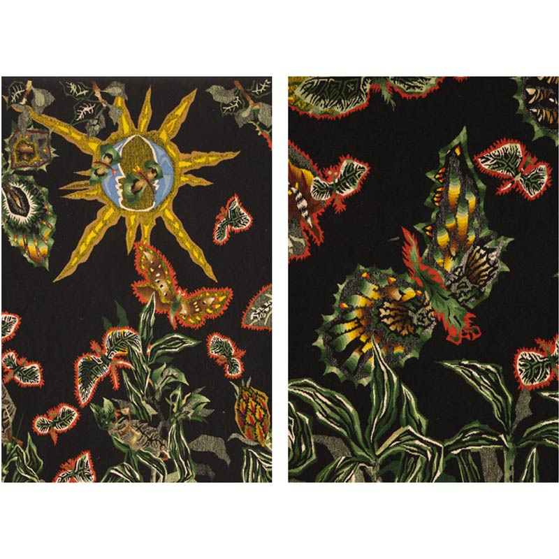 Rather than focusing on a single motif, Lurçat distributes attention across the surface. Butterflies and moths move throughout the field, their wings marked with eye-like patterns that repeat and echo across the design. These forms introduce a sense of movement and unpredictability, offsetting the stability of the vertical plant structures.
