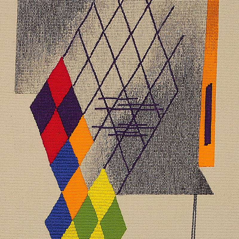 Originating from collages first presented in 1919 on a rotating structure, the Revolving Doors series was conceived with motion as a fundamental principle. This quality is preserved in the tapestry, where the arrangement of forms maintains a sense of perpetual transition.
