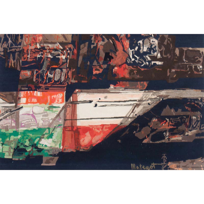 The composition presents a stylized interpretation of an urban skyline, evoking the vertical density and architectural rhythm of Manhattan. Rather than depicting the city with precision, Matégot distills it into a network of fragmented lines and tonal blocks. Against a deep blue ground, the skyline emerges in layered shades of rust, brown, and muted grey, suggesting both industrial materiality and atmospheric depth.