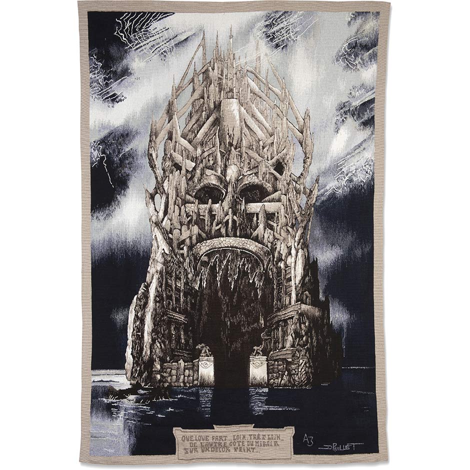 At a monumental scale, the L’île des morts tapestry transforms Druillet’s interpretation of this legendary motif into a commanding architectural presence. The woven surface encourages slow viewing, revealing intricate details and tonal variations that emerge gradually as the eye moves across the composition.