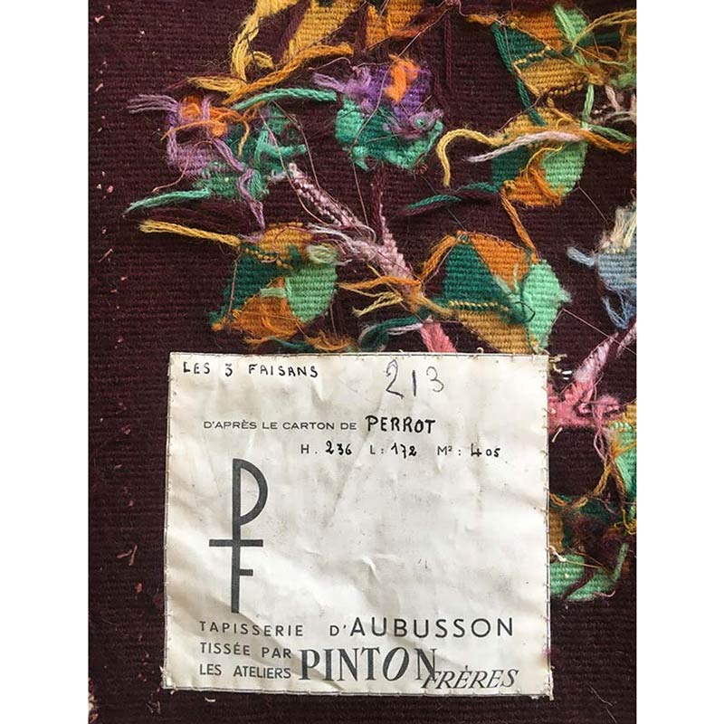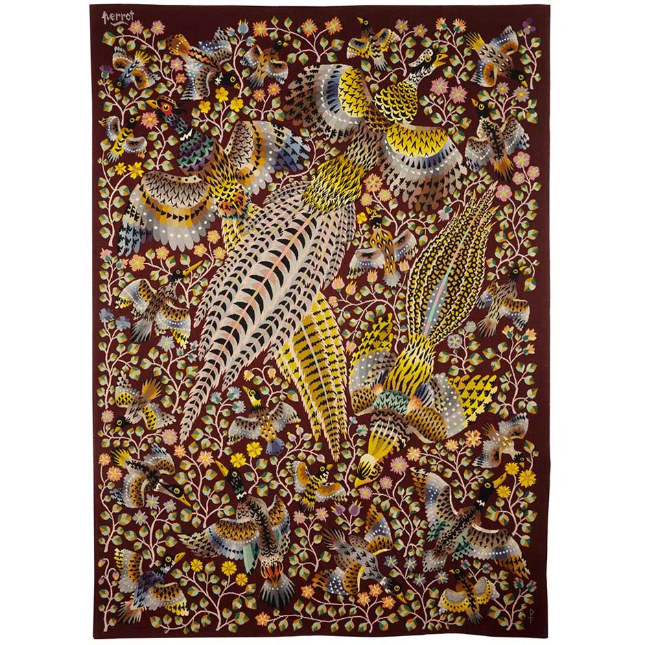 Les Trois Faisans (The Three Pheasants) is a richly detailed tapestry by René Perrot, woven at the renowned Pinton Frères workshop in Aubusson. The composition reflects Perrot’s deep engagement with nature, expressed through a highly decorative and immersive visual language that emphasizes texture, pattern, and density.
