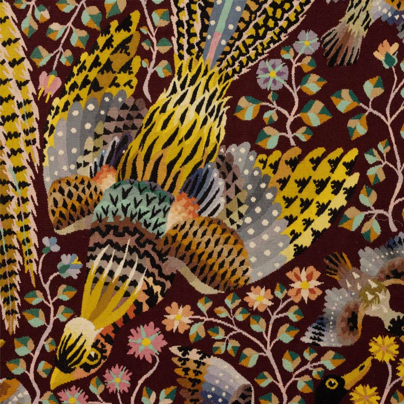 Set against a deep burgundy ground, the tapestry takes on a warm, intimate tone. This rich background enhances the vibrancy of the overlaid forms, allowing the intricate details of both the birds and the surrounding flora to stand out with clarity. The palette evokes an autumnal atmosphere, grounding the composition in a sense of seasonal depth.