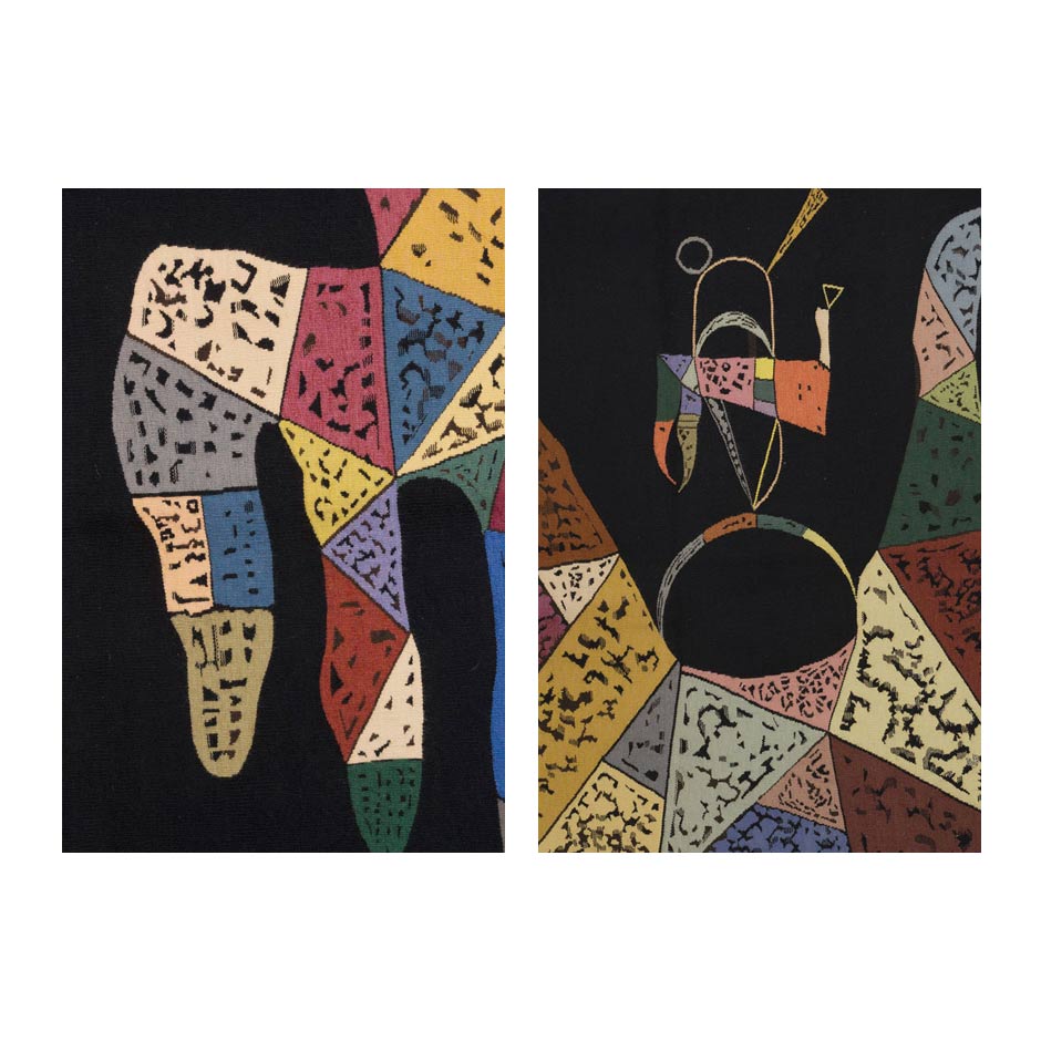 Sur fond noir (On Black Background) is a tapestry after Vassily Kandinsky, woven at the Atelier Tabard in Aubusson. The work reflects his later period, where structure gives way to more fluid, organic forms and color becomes the primary vehicle for expression.