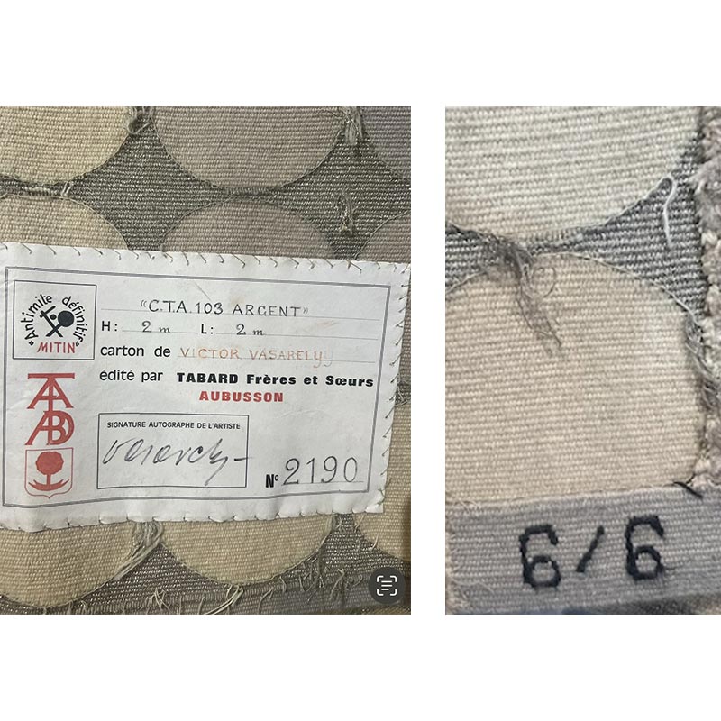 Signed on the bolduc and preserved in perfect original condition, C.T.A. 103 Argent stands as a museum-quality example of Vasarely’s work in textile. With its rarity, historical importance, and innovative use of materials, it represents a foundational piece within both his oeuvre and the evolution of modern tapestry.